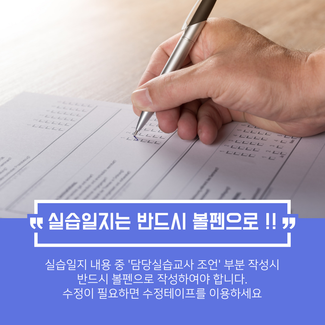 실습일지 내용 중 실습담당교사님이 작성하여 주시는 '담당실습교사 조언'부분은 반드시 볼펜으로 작성하여야 합니다.